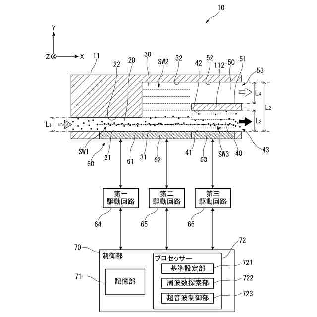 本実施形態において、流入流路20、分離流路30、第一流出流路40および第二流出流路50の各流路は、任意の一方向に沿って配置され、流体を当該一方向に沿って流通させる。ここで、各流路における流体の流通方向(本開示の第一方向)をX方向とし、流体の流通方向の上流側を-X側とし、流体の流通方向の下流側を+X側とする。また、X方向に直交する一方向であってかつ後述の定在波SW1~SW3が形成される方向(本開示の第二方向)をY方向とし、Y方向の一方側を-Y側とし、Y方向の他方側を+Y側とする。また、X方向およびY方向のそれぞれに直交する方向をZ方向とする。