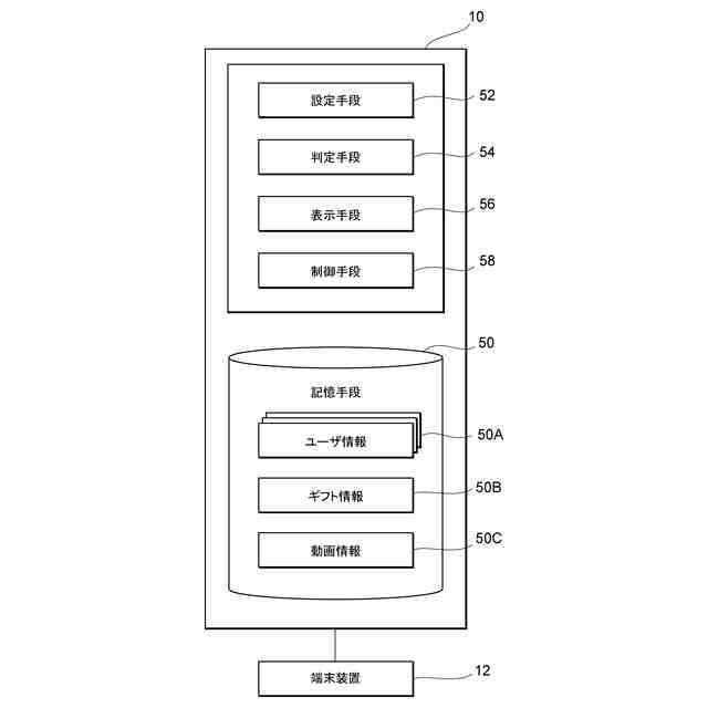 【解決手段】プログラムがコンピュータを、ユーザが自動的にギフトのギフティング要求を行うためのギフティング条件を設定する設定手段52、動画に登場する演者オブジェクトによる動作がギフティング条件を満たしているか否かを判定する判定手段54、判定が肯定された場合に、ユーザからギフティング要求があったとして動画にギフトを表示させる表示手段56、として機能させる。