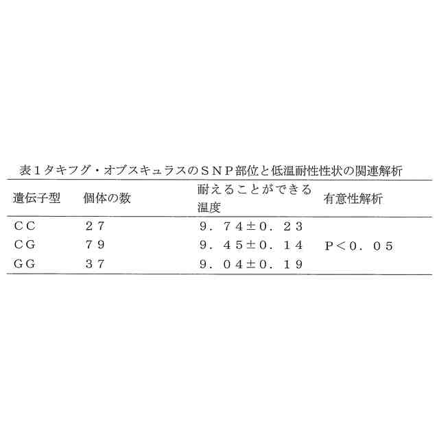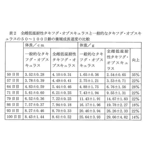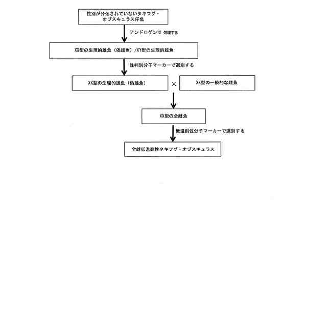 技術的解決手段:本発明に記載の低温耐性性状を持つタキフグ・オブスキュラスの全雌新種育成方法であって、