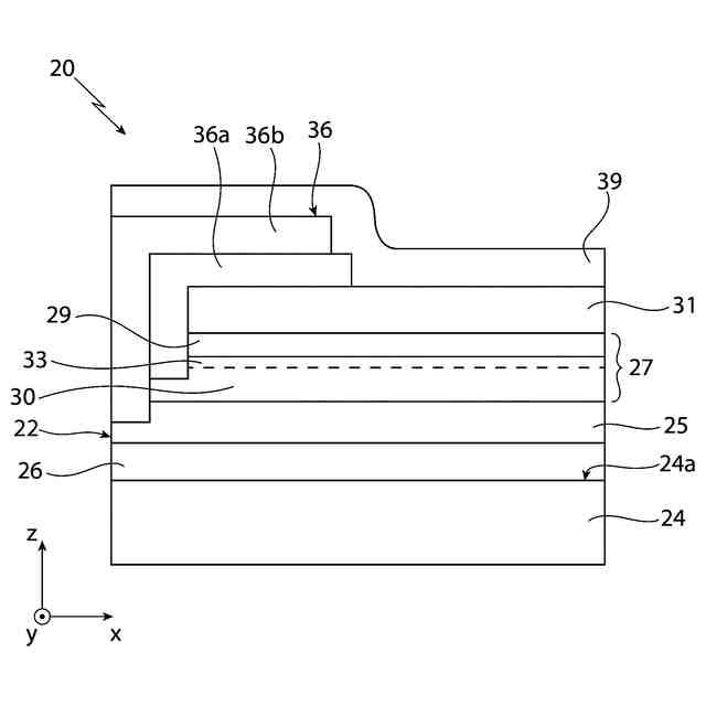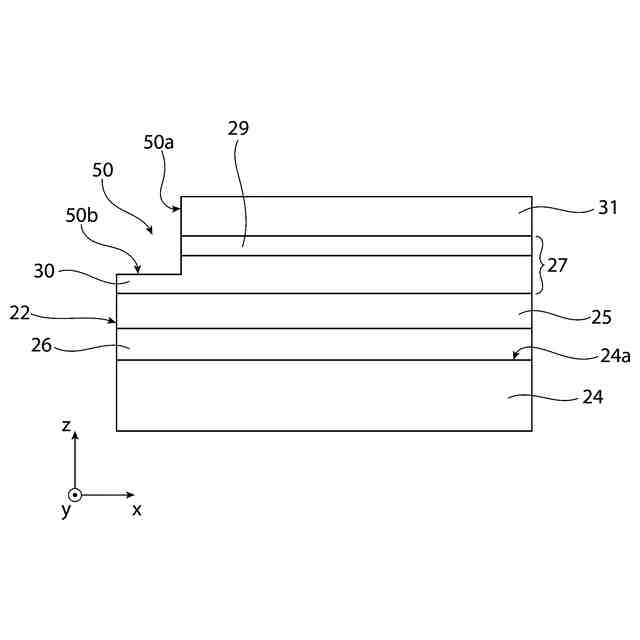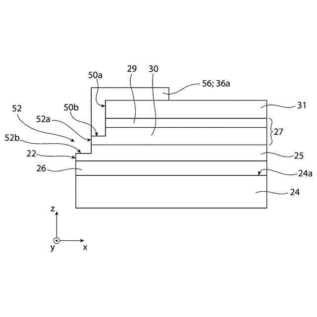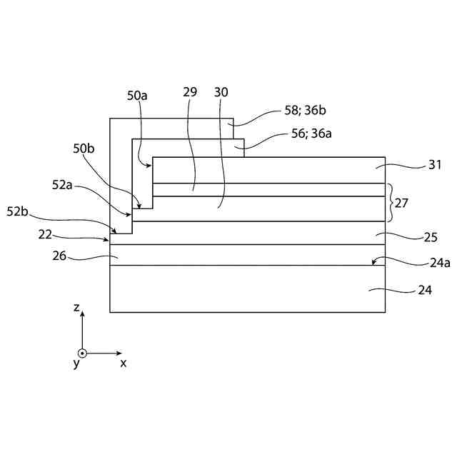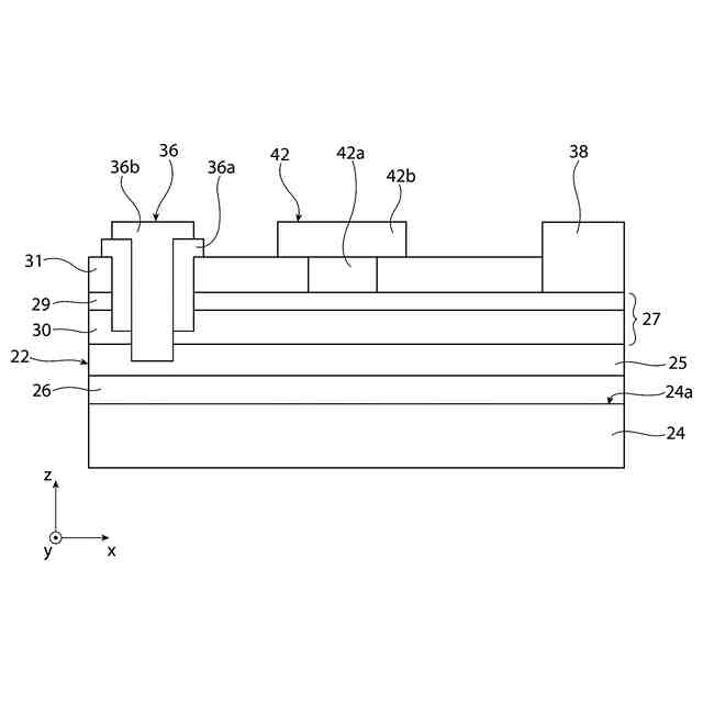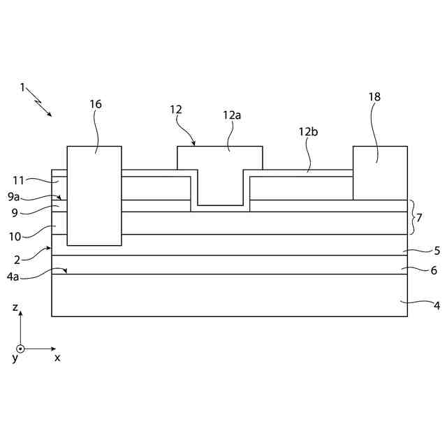 図1は、互いに直交する軸x、y、zの三軸系における既知のタイプのHEMTデバイス1の一部分を、xz平面における側断面図で概略的に示す。特に、HEMTトランジスタ1は、リセスゲート型トランジスタである。