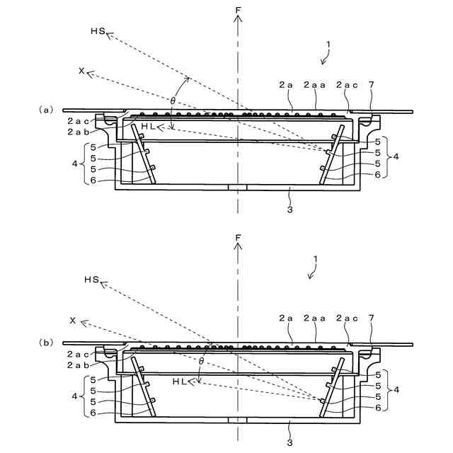 【解決手段】前面2aa側が外部に露出して設けられる発光表示部2aと、発光表示部2aの背面2ab側後方の位置に設けられる光源部4と、を備え、光源部4は、半値角θ内の光が、発光表示部の正面方向Fに対して傾斜しながら、発光表示部2aの左右いずれか一方の側から左右反対の他方の側に向かう配置で設けられる発光素子5を有し、発光表示部2aは、背面2abが略フラットであることを特徴とする。