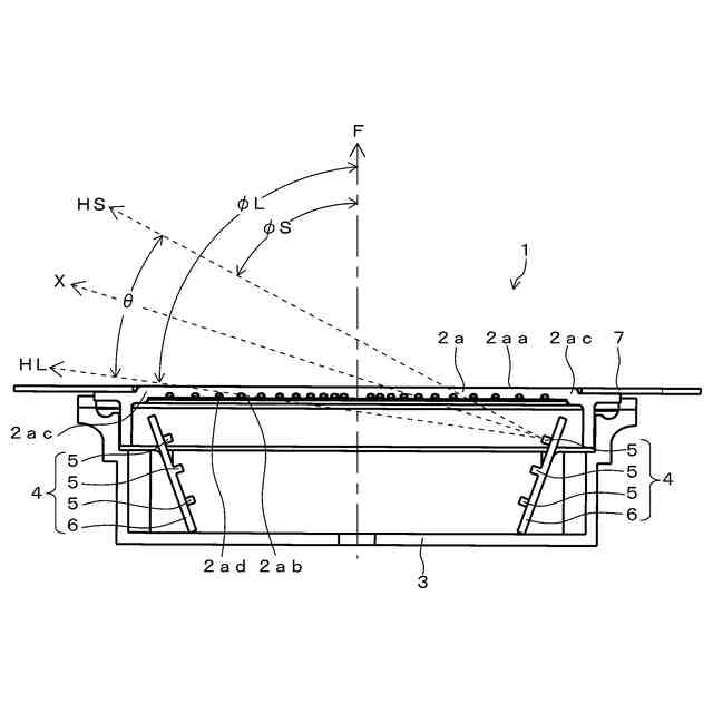 この発明において、前記発光表示部は、前面が略フラットであるものとすることができる。前記発光素子は、半値角内の光が、前記発光表示部の正面方向に対して傾斜しながら、前記発光表示部の左右いずれか一方の側端部の側の背面側後方から左右反対の他方の側端部の側の背面側に向かう配置で設けられるものとすることができる。前記発光素子が複数実装されて設けられて、前記発光表示部の正面方向に対して傾斜して設けられる発光素子基板を有するものとすることができる。前記発光素子基板は、平面視凸状の形状を有し、その凸状の形状の突出部分が前記発光表示部の背面側に向かう向きで設けられものとすることができる。前記複数の発光素子のうち、前記発光表示部の背面に最も近接して設けられる発光素子は、半値角内の光のうち、前記発光表示部の正面方向に対する傾斜の角度が大きい側の半値角の限界角度上の光が、前記発光表示部の前記他方の側の側端部近傍位置を透過する配置で設けられるものとすることができる。前記発光表示部の背面側後方に位置して、前記発光素子が放射する光を前記発光表示部の前記他方の側の側端部側及び/又は中心部側に反射させる反射部をさらに備えるものとすることができる。前記発光素子は、後方に弧状のU字状か、前方に弧状の逆U字状に並んで設けられるものとすることができる。