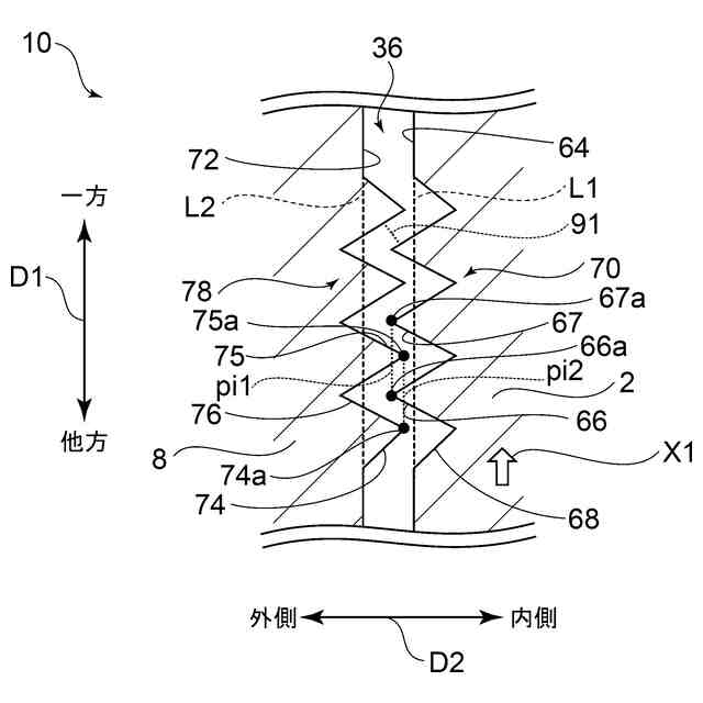 前記第1ジグザグ形状および前記第2ジグザグ形状との間に形成される遊びは、前記第3ジグザグ形状および前記第4ジグザグ形状との間に形成される遊びよりも大きい、