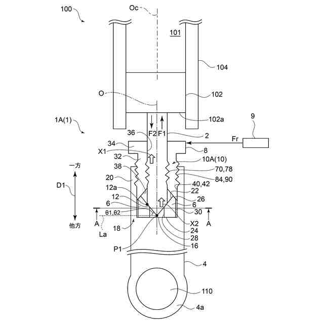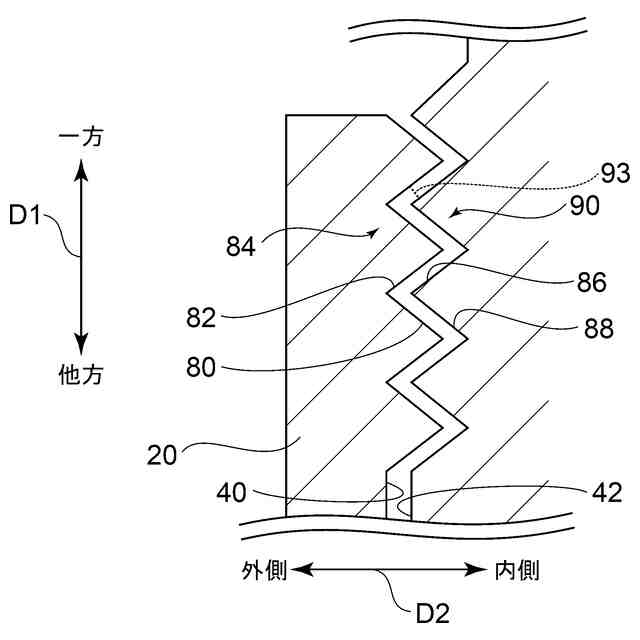 前記押込部材の前記貫通孔に面し前記径方向の内側の内側面に前記第1谷部に係合される第2山部と前記第1山部に係合される第2谷部とが交互に並んだ螺旋状の第2ジグザグ形状と、を含む、