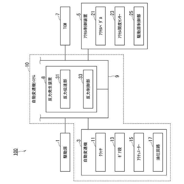 【解決手段】自動変速機システム10は、クラッチ11と、ギア段13と、を有し、車両100の推進力を発生させる駆動源1にクラッチ11を介して連結され、クラッチ11およびギア段13を自動で制御して変速を行う自動変速機3と、運転者によるアクセルオン操作に対してアクセルペダル21に反力を与える反力発生装置8と、を備えている。反力発生装置8は、変速の種類に応じてアクセルペダル21へ与える反力の大きさを変える。