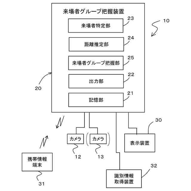 【解決手段】来場者グループ把握システム10は、所定場所を撮影する少なくとも1つのカメラ12、13と、少なくとも1つのカメラ12,13で撮影された画像を分析して少なくとも1人の来場者を特定し、撮影された画像から、特定された来場者と他の来場者との距離を推定し、推定された距離から、特定された来場者を単独来場とグループ来場とのいずれかに分類すると共に、特定された来場者がグループ来場の場合に特定された来場者が属するグループの人数を推定する来場者グループ把握装置20とを含む。