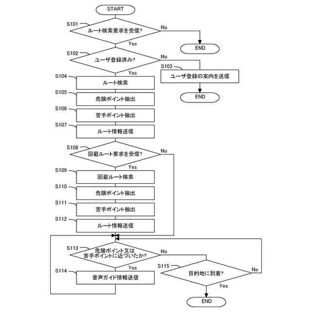 また、制御部は、第一条件に応じて第一ルート上で事故の発生に関連するポイントである危険ポイントを特定する。第一条件は、例えば、地理的条件、道路交通情報に応じた条件、複数の車両から取得した条件、天気に応じた条件、及び時間帯に応じた条件の少なくとも一つの条件である。これらの条件は、事故の起こりやすさに関連している条件でもある。また、制御部は、第二条件に応じて第一ルート上で車両のユーザが苦手とするポイントである苦手ポイントを特定する。第二条件は、例えば、ユーザにより選択された条件、ユーザの車両から取得した条件、天気に応じた条件、及び時間帯に応じた条件の少なくとも一つの条件である。この苦手ポイントは、ユーザが苦手とする運転を強いるポイントでもある。