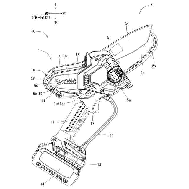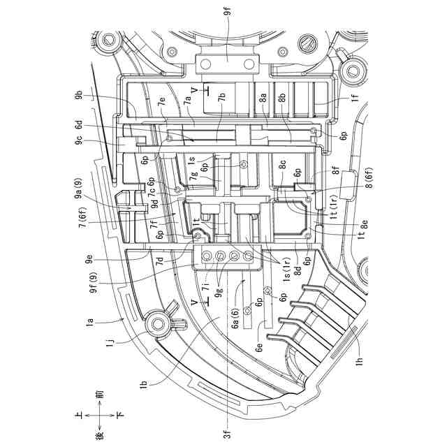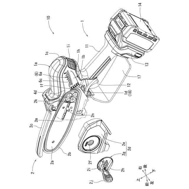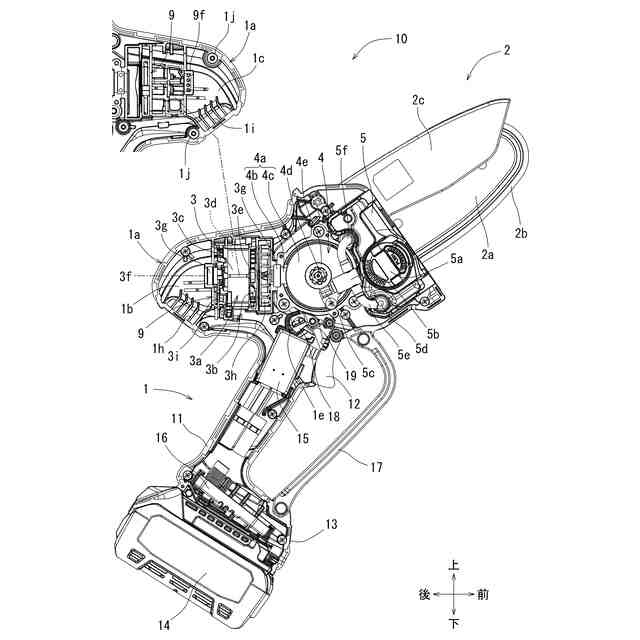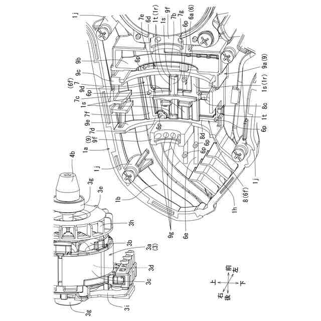 右側ハウジングを取り外した状態の電動作業機の右側面図である。