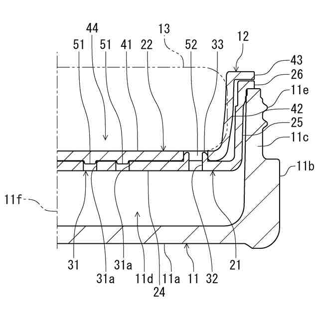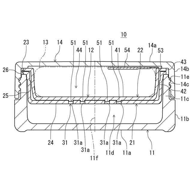 パウダー容器10は、内容物(不図示)を収納する容器本体11と、容器本体11の上部に取り付けられる中蓋部材12と、内容物の塗布用のパフ13と、中蓋部材12に収納されたパフ13を上方から覆うキャップ14とを備える。
