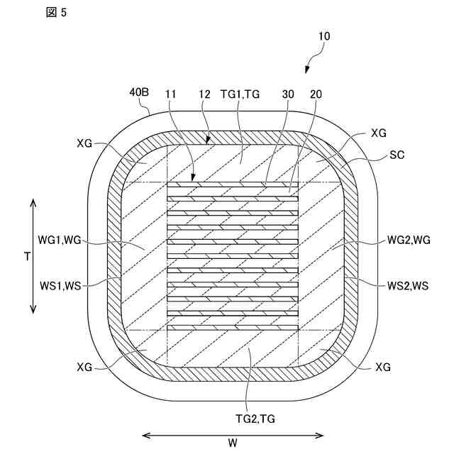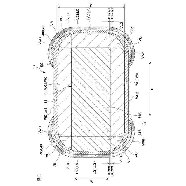 前記端面側無効部と前記垂直稜線無効部との境界部における外表面と、前記垂直稜線無効部の外表面と、前記垂直稜線無効部と前記側面側無効部との境界部における外表面とは、前記積層方向からの平面視において外方に突出する連続した湾曲面を形成し、