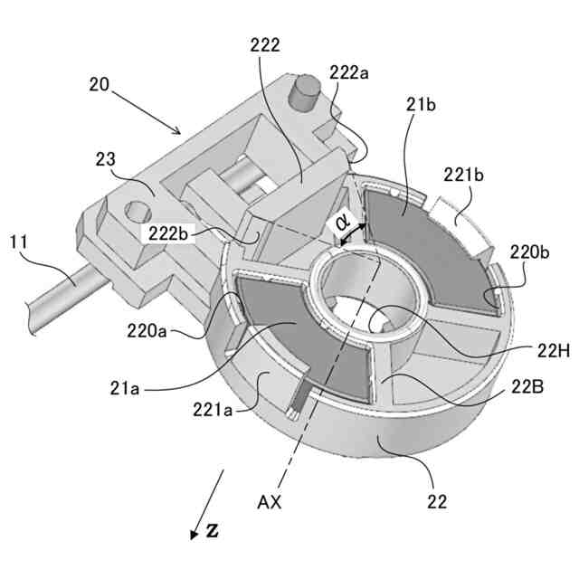磁石を保持し、軸線を中心に形成された軸部が挿入される円環状のホルダを有し、前記軸部に対して回転可能な回転部と、