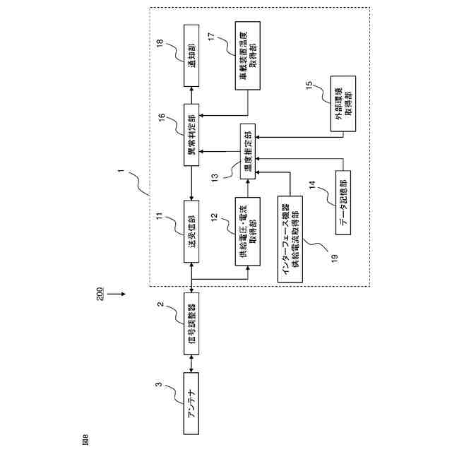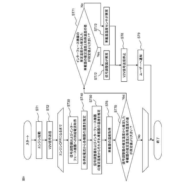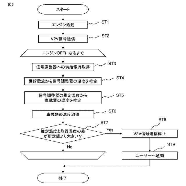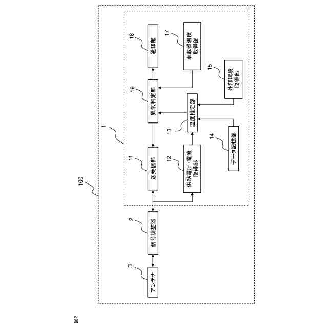 車車間通信では、送受信用のアンテナ近傍に信号レベルを調整する信号調整器を使用する場合がある。信号調整器の中には送受信の切り替えタイミングの制御などの為に、通常車内に設置されている車載器と制御信号をやり取りするものと、信号調整器単独で制御し制御信号を必要としないものがある。後者は車載器側と車車間通信用信号の送受信と電源の供給のみを実施するが、信号調整器に異常が発生した際に車載器に知らせることができない。異常通知の為、信号調整器に温度センサを取り付け、温度を監視することで信号調整器の異常を検知する技術が報告されている(例えば特許文献1参照)