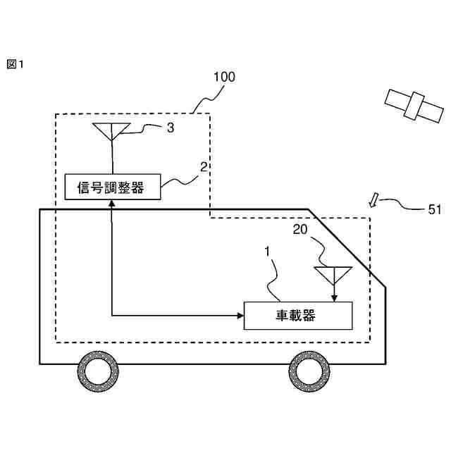図1は、実施の形態1による車載通信装置を搭載した車両の模式図である。以下では、車載通信装置として、車車間通信用の無線信号を自車と他車の間でやり取りし、車両の情報を送受信する車車間通信用の車載通信装置を例に説明する。車載通信装置100は、メイン機器として、車内に配置される車載器1と、車外など車載器1とは温度環境が異なる位置に設置されるアンテナ3、およびアンテナ3に近い位置、すなわち車載器1とは温度環境が異なる位置には、他車との通信をより確実にするため、無線信号の振幅を調整する信号調整器2が設けられている。車車間通信の場合、自車と他車との間で同期をとる必要があり、GNSS(全地球航法衛星システム:Global Navigation Satellite System)の信号51を受信することで得られる高精度な1PPSの信号によって同期する。このため、GNSS用のアンテナ20が備えられている。GNSS用のアンテナ20は通常車内に配置される。なお、本開示の車載通信装置は、車車間通信のみならず、いわゆる路車間通信など、自車と自車から離れた通信対象との通信にも適用可能であり、同期を必要としない通信、あるいはGNSS以外の信号で同期させる場合などでは、GNSS用のアンテナ20は必須ではない。