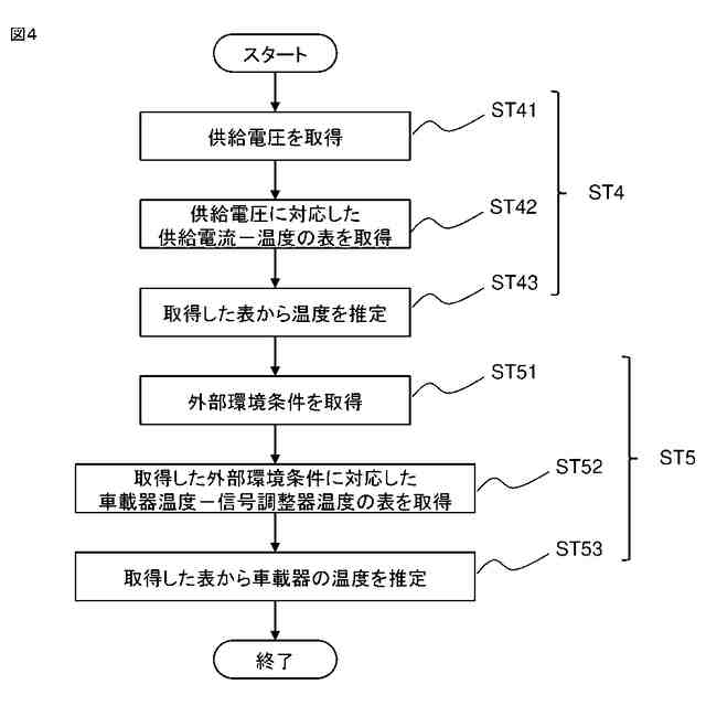 前記車載器は、前記信号調整器への供給電流に基づいて前記信号調整器の温度を推定するよう構成されたものである。