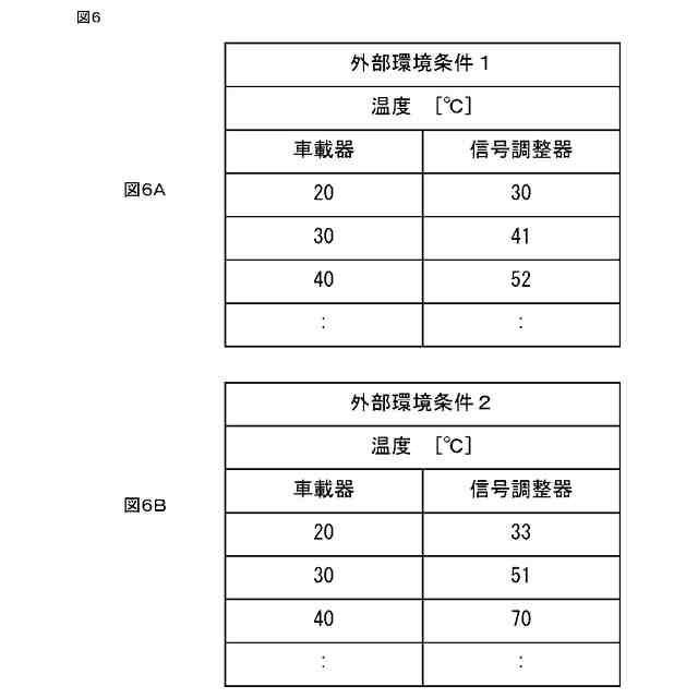 実施の形態1による車載通信装置の車載器と信号調整器の温度の関係を記憶するデータ記憶部のデータの一例を示す図である。図である。