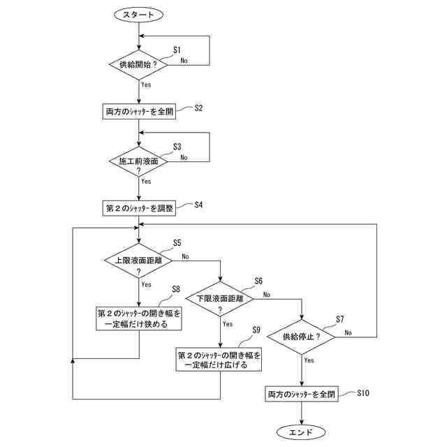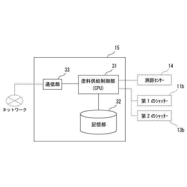 塗料の供給開始の指示に従い前記塗料流出用シャッターと前記供給量調整用シャッターとを全開にする制御、および塗料の供給停止の指示に従い前記塗料流出用シャッターと前記供給量調整用シャッターとを全閉にする制御、を行う、