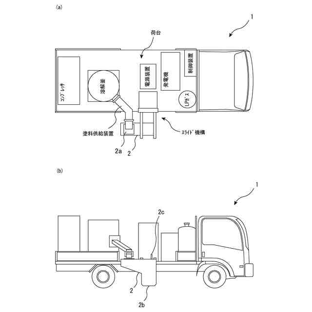 具体的にいうと、下記特許文献1には、車両(トラック)を利用して区画線施工用の塗料を路面に噴射するための構成として、たとえば、発電機、コンプレッサ、LPガスボンベおよび溶解釜等とともに、車両の走行に伴って路面に路面用ペイント(上記塗料に相当)をライン状に塗布する路面用ペイント塗布装置(以降、単に塗布装置と呼ぶ)が搭載されていること、が開示されている。