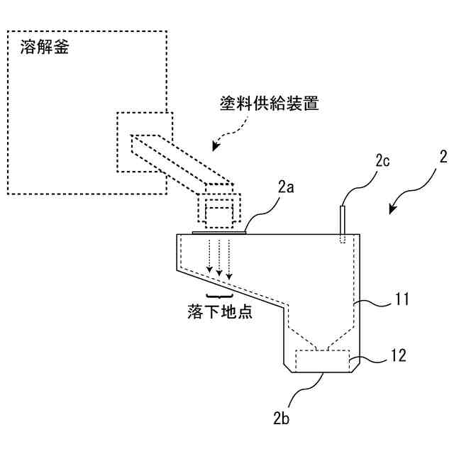 塗料を貯留し前記塗料の流入口へ塗料を放出する塗料ホッパーとともに塗布装置を構成し、当該塗布装置が区画線施工用の車両に搭載された状態において、