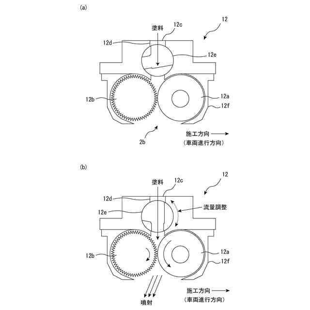 開閉制御により前記塗料流出弁を通過した塗料が、対抗する外周面がそれぞれ下方向に向かって軸回転する前記第1の回転体と前記第2の回転体との間に落下する構造を有し、当該構造により落下してきた塗料を前記二軸回転体の遠心力を利用して路面に噴射する、