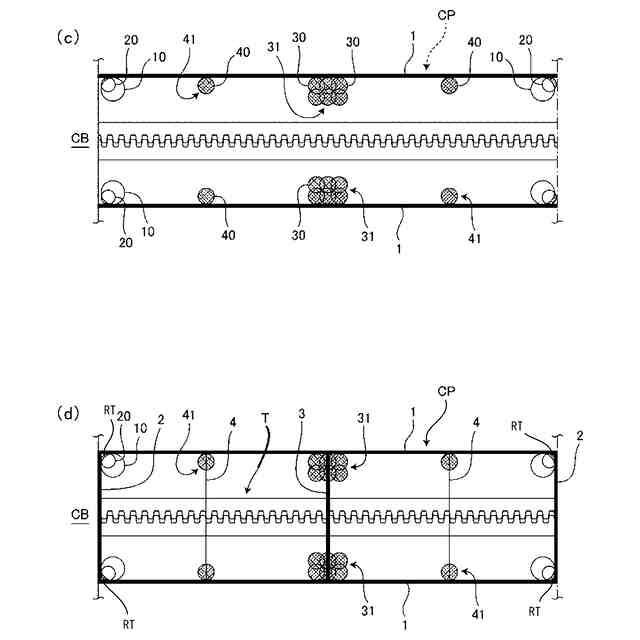 次に、第1切断溝101,101の間であって両端から所定距離内側の位置にそれぞれ、前記第1切断溝101,101と同じ深さ寸法の第2切断溝102,102を形成することによって、平面視が帯状の切断片部CPを形成する。このとき第1切断溝101,101の両端部はそれぞれ、第2切断溝102,102より外側の位置まで延設された様態になっており、この部分が所謂余切り105,105、105,105として、回転ブレードによる床板F,Fの深さ方向の切断寸法を担保している。