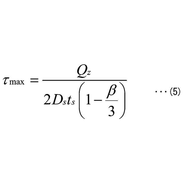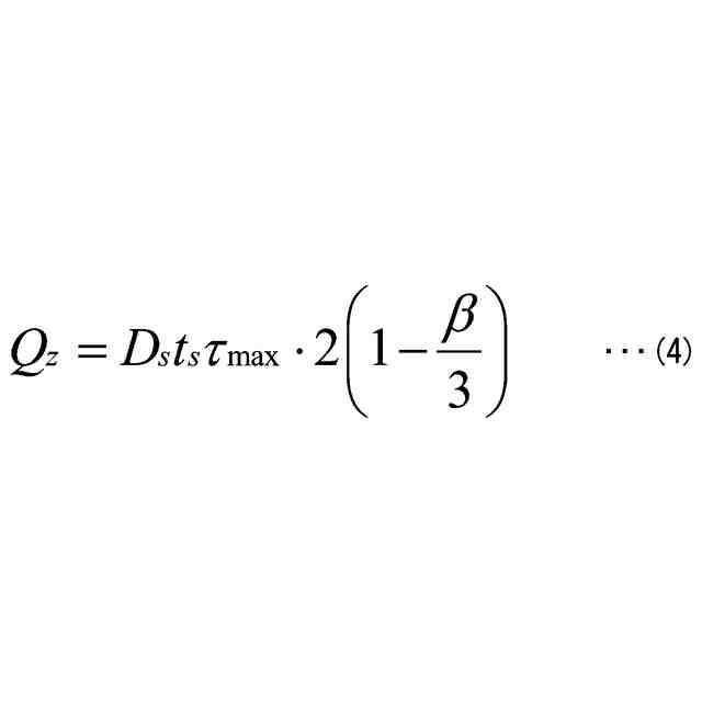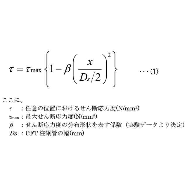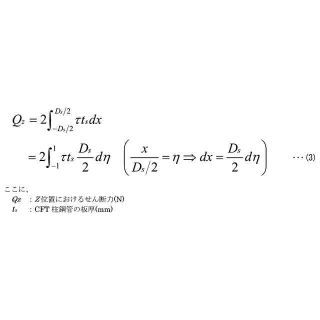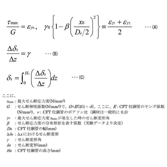 として、式(1)のように表し、せん断変形角γを式(2)で表し、式(1)よりβを求め、これを式(2)に代入してγを算出した後、ΔzにおけるγをCFT柱鋼管高さH