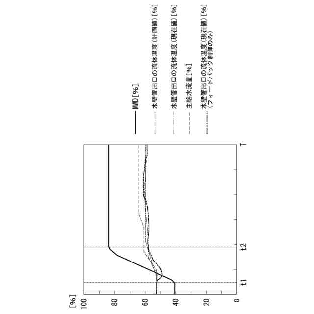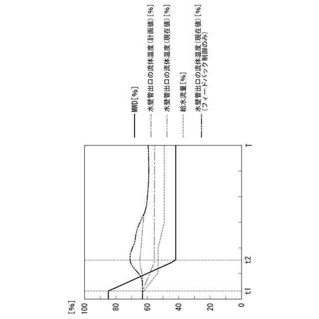 ボイラの負荷上昇時において、ボイラの給水流量、燃料流量、空気流量の応答速度はそれぞれ異なる。例えば、給水流量は、燃料流量よりも早く所定量へ変更することが可能である。このため、給水流量と燃料流量との比率が適切な状態でなくなってしまい、この結果、ボイラの火炉壁を構成する水壁管の出口における流体(水)の温度が一時的に低下してしまう。さらに、ボイラの燃焼ガスが流れる方向において火炉の後段に位置する過熱器や再熱器に流入する蒸気の温度も低下してしまう。反対に、ボイラの負荷低下時には、ボイラ入熱量の応答遅れにより、過熱器の出口における蒸気の温度が想定に反して上昇してしまう場合がある。これらの傾向は、前述の理由により固体燃料焚きボイラにおいて特に顕著となる。このため、ボイラの負荷変化時における温度特性への影響を抑制し、ボイラの制御を安定化する必要がある。