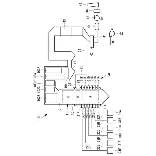 発電用ボイラなどの大型のボイラは、中空形状をなして鉛直方向に設置される火炉を有し、この火炉壁に複数のバーナが火炉の周方向に沿って配設されている。また、大型のボイラは、火炉の鉛直方向上方に煙道が連結されており、この煙道に蒸気を生成するための熱交換器が配置されている。そして、バーナが火炉内に燃料と空気(酸化性ガス)との混合気を噴射することで火炎が形成され、燃焼ガスが生成されて煙道に流れる。燃焼ガスが流れる領域に熱交換器が設置され、熱交換器内を流れる水や蒸気を加熱して過熱蒸気が生成される。