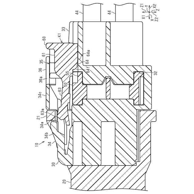 【解決手段】コネクタ10は、相手側コネクタ20に対して第1軸線Xに沿った嵌合方向X1に相対移動されることで相手側コネクタ20に嵌合可能なコネクタハウジング30と、コネクタハウジング30内に収容される端子と、コネクタハウジング30に装着されることによってコネクタハウジング30からの端子の抜けを阻止するリテーナ50と、コネクタハウジング30が相手側コネクタ20に嵌合された状態で仮係止位置から本係止位置K2に移動されることによって相手側コネクタ20からのコネクタハウジング30の離脱を阻止するコネクタ位置保証部材60とを備える。コネクタ位置保証部材60は、本係止位置K2にある状態でコネクタハウジング30からのリテーナ50の移動を阻止するようにリテーナ50と係合する係合凸部64を有する。