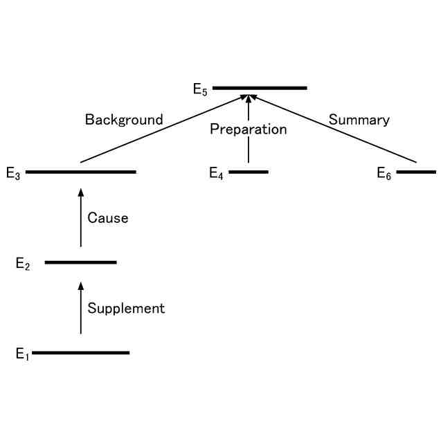 修辞構造木から談話依存構造木への変換過程を説明するための第1の図である。