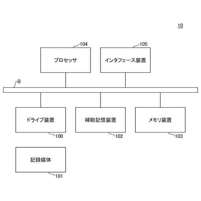 以下、図面に基づいて本発明の実施の形態を説明する。図1は、本発明の実施の形態における要約装置10のハードウェア構成例を示す図である。図1の要約装置10は、それぞれバスBで相互に接続されているドライブ装置100、補助記憶装置102、メモリ装置103、プロセッサ104、及びインタフェース装置105等を有する。