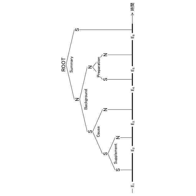 イベントを葉ノードとする修辞構造木の一例を示す図である。