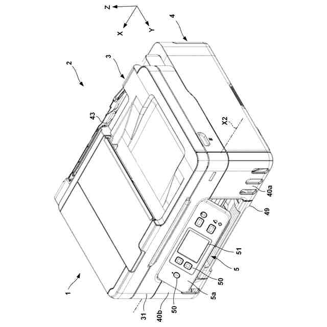 図1は本発明の一実施形態に係る電気機器1を前側から見た外観図である。本実施形態の電気機器1は、液体としてインクを吐出して記録媒体に記録を行うインクジェット記録装置(複合機)であるが、本発明はインクジェット記録装置以外の各種の電気機器にも適用可能である。図中、矢印X及びYは互いに直交する水平方向を示し、矢印Zは上下方向(重力方向)を示している。X方向は電気機器1の幅方向(左右方向)である。Y方向は電気機器1の奥行方向(前後方向)である。