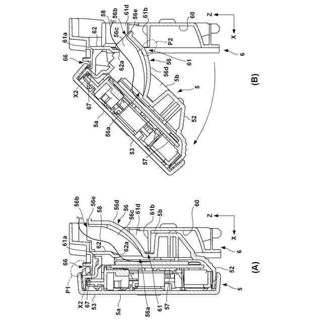 操作パネルの姿勢を変化態様を示す操作パネル及び支持フレームの断面図。