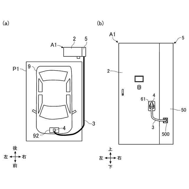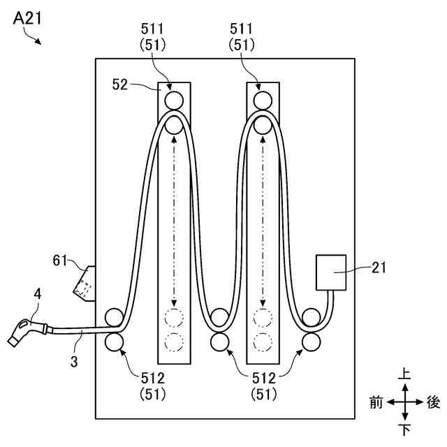 特許文献1に記載の充電スタンドの利用者は、電気自動車を充電する際、充電ケーブルの先端にある充電ガンを、電気自動車の充電ポートに接続する。この時、引っ掛け部と補助引っ掛け部とに交互に巻き付けられた充電ケーブルを引き出す必要がある。また、電気自動車の充電終了後には、引き出した充電ケーブルを、引き戻しつつ、引っ掛け部と補助引っ掛け部とに交互に巻き付ける必要がある。充電ケーブルは、太く重たいものがあるため、充電ケーブルの引き出しや巻き付けに、労力が必要である。例えば、急速充電器の充電ケーブルには、重さが1.5kg/mであるものもある。