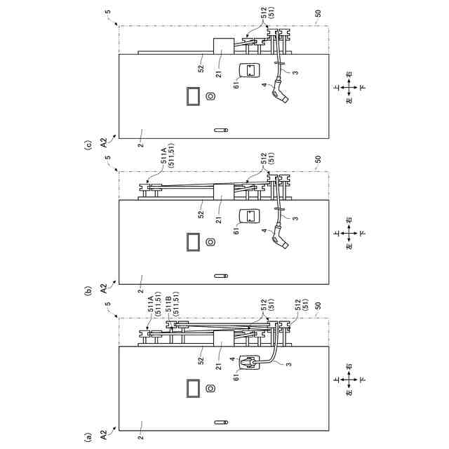 前記充電装置の好ましい実施の形態において、前記ケーブル収納部は、追加の移動式ローラを含むことで2つの移動式ローラを含み、且つ、前記本体部の外方に配置されており、前記2つの移動式ローラは、前記本体部に近い側の内方ローラと、前記本体部から遠い側の外方ローラとを含み、前記駆動部は、前記充電ケーブルの送り出しでは、前記外方ローラ、前記内方ローラの順に移動させ、前記充電ケーブルの引き戻しでは、前記内方ローラ、前記外方ローラの順に移動させる。