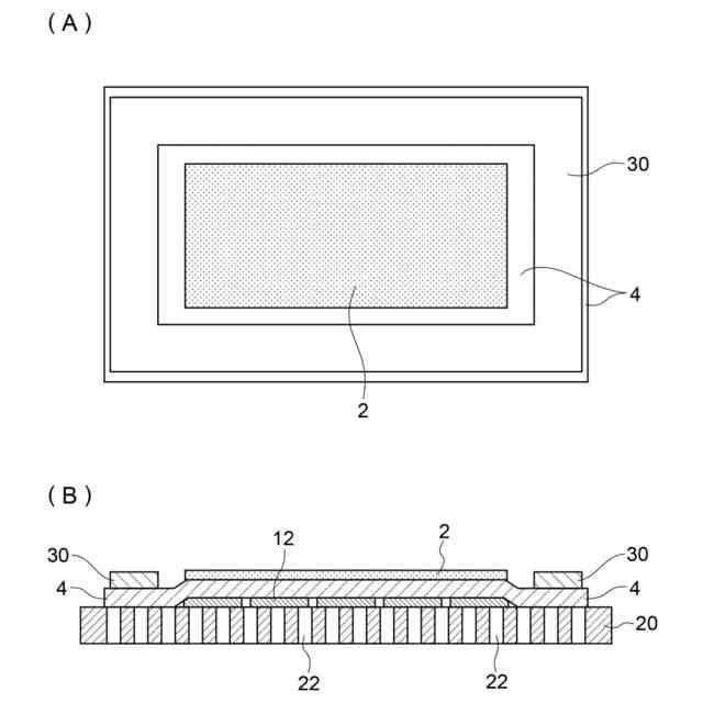 (A)は、正極合材塗布膜を有する側の面が吸着台に吸着され且つ他方の面における負極合材塗布液が塗布されない未塗布部が治具で固定された状態の電極箔を示す概略上面図であり、(B)は(A)の概略断面図である。
