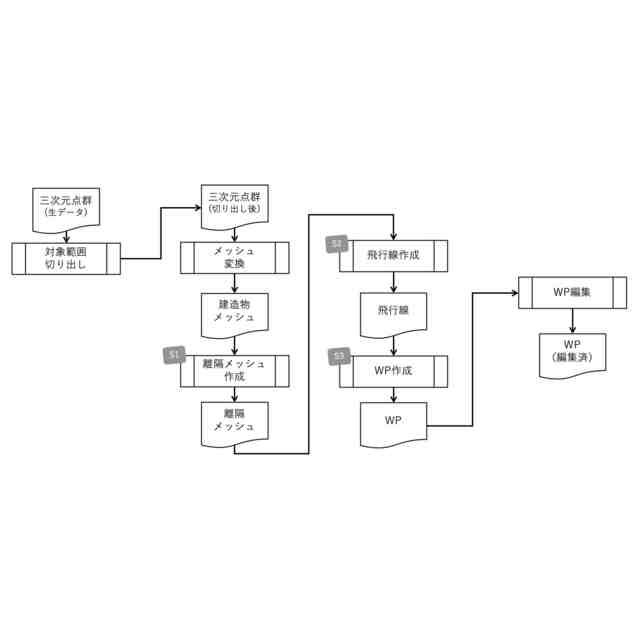 WPを作成するステップにおいて、次のWPの決定の際に、飛行線の所定の線分間の位置が求められることにより、所定の距離だけ離れた次のWPが決定されることを特徴とする請求項1に記載の飛行経路作成方法。