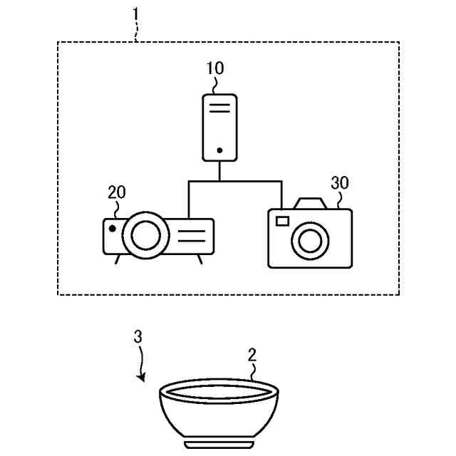 図1は、本実施形態に係る投影システム1の構成の一例を示す図である。投影システム1は、有線又は無線で互いに接続される情報処理装置10、投影装置20、及び撮影装置30を備えている。投影システム1は、投影対象物2の表面である投影面3に画像を投影する。ここで、画像は複数の画素で構成され、各画素は色情報を有している。