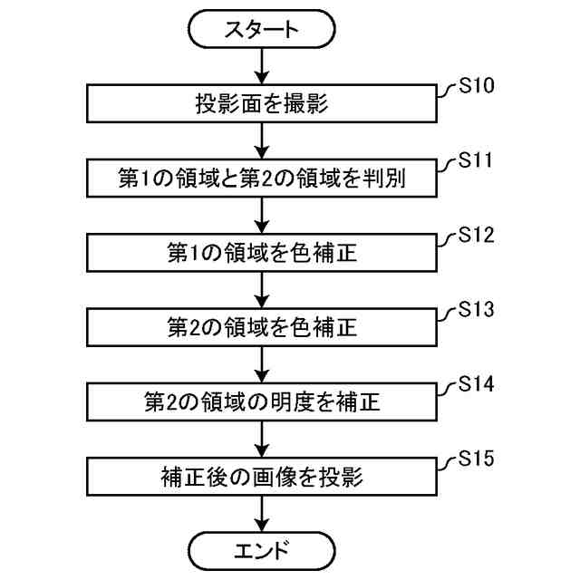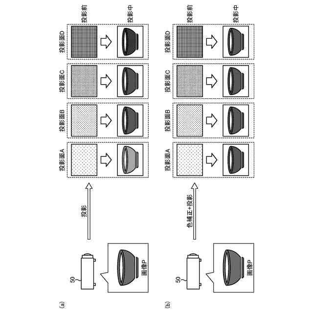 特許文献1には、予め設定された第1色情報と、投影面上に投影された画像の第2色情報とに基づいて、投影面上に投影された前記画像の画素又はブロック毎に、色の見え(色の見え方)を一致させる色変換を生成する色変換生成ステップと、入力画像の画素あるいはブロック毎に前記色変換を用いて色補正する色補正ステップとを備えることが開示されている。