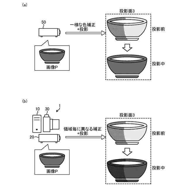 従来、物体に画像を投影し、その物体の色やテクスチャを様々に変化するように見せることができるプロジェクションマッピングという手法が用いられている。また、画像が投影される投影面の素材の色や照明光の色が変化した場合でも、投影された画像を所望の色に見せるように色補正を行う技術が知られている。