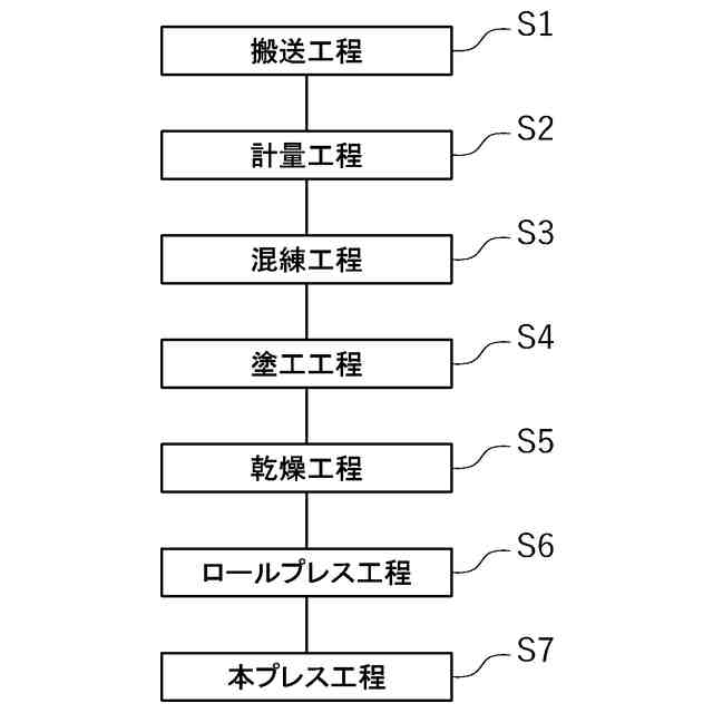 図1は、電極シート製造装置1による製造のフロー図である。図1に示すように、電極シート製造装置1における製造には、用意工程S1~S5と、ロールプレス工程S6と、本プレス工程S7が含まれている。この実施形態では、用意工程には、搬送工程S1と、計量工程S2と、混錬工程S3と、塗工工程S4と、乾燥工程S5と、が含まれている。ただし、電極シート製造装置1における製造において、他の工程を含んでいてもよい。