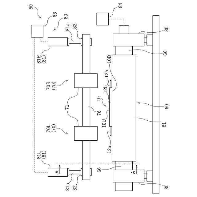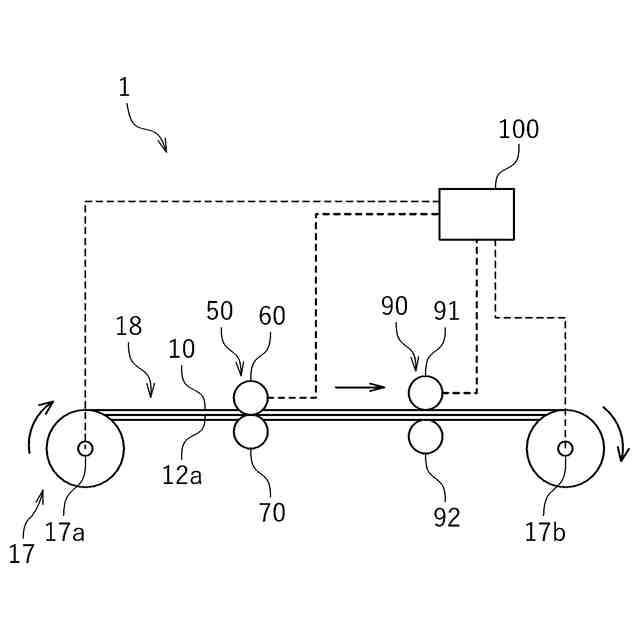 電極シート製造装置1では、蓄電デバイスを構成する電極シート10(図2参照)が製造される。電極シート10は、蓄電デバイスの内部に収容される電極体の正極シートまたは負極シートを構成する。蓄電デバイスとは、繰り返し充放電可能なデバイスをいい、リチウムイオン二次電池、ニッケル水素電池、ニッケルカドミウム電池等のいわゆる蓄電池(すなわち化学電池)の他、電気二重層キャパシタ等のキャパシタ(すなわち物理電池)を包含する概念である。以下、一例として、リチウムイオン二次電池に用いられる電極シート10の構成と併せて、電極シート10を製造する電極シート製造装置1について説明する。