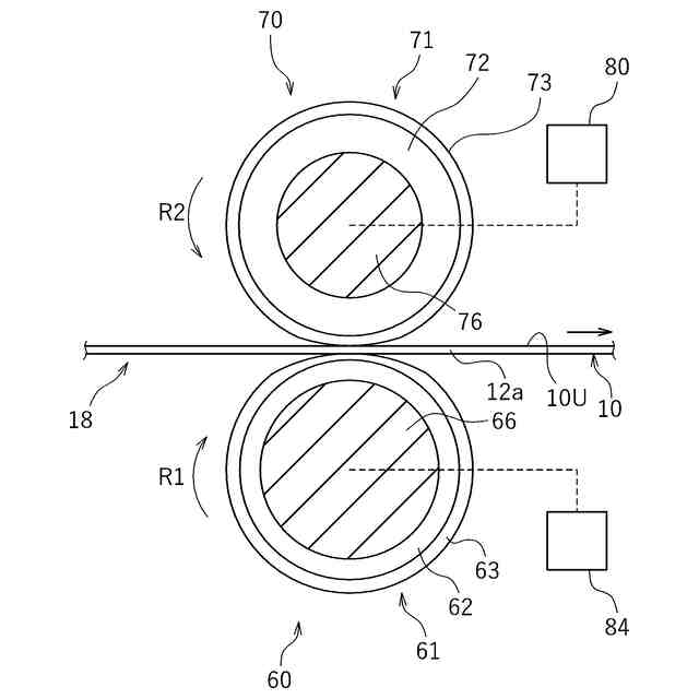 図6は、電極シート10と、支持ロール60と、押圧ロール70との位置関係を示す模式図である。