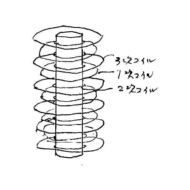 さらにこの一次コイルの外側に、三次コイルを持ってくる。これにより外に広がる磁力線を出来るだけ取り込む事ができる、つまり三重コイルである。
