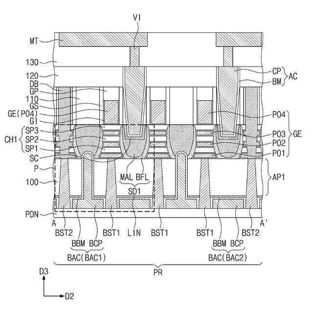 前記基板を貫通して前記ソース及びドレーンパターンの中でいずれか1つと電気的に連結される背面活性コンタクト、をさらに含み、