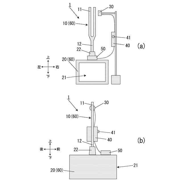 共鳴装置は音叉が発した音を長時間持続させることができる装置である。図1に示すように共鳴装置1は発音体60(音叉10、共鳴箱20)、マイクロフォン30、アンプ40及び振動スピーカー50から概略構成される。