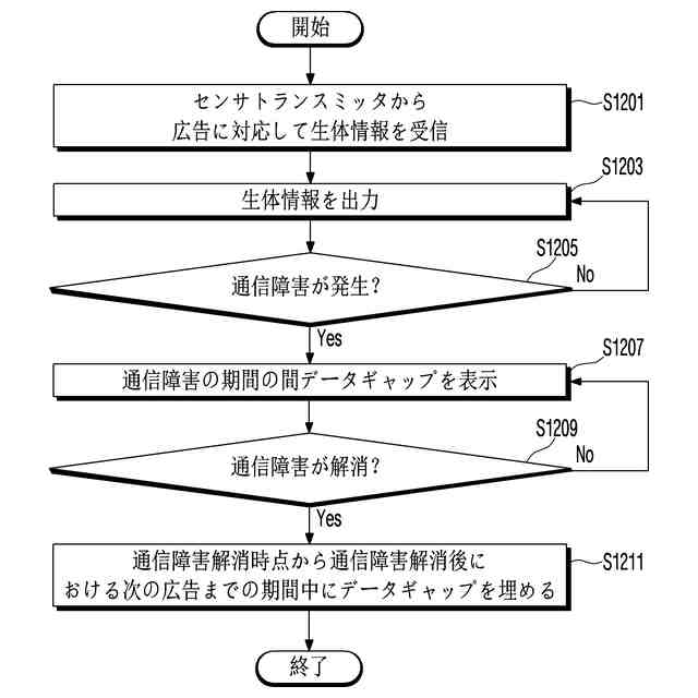 前記通信障害が解消された後における最初の広告において前記データギャップを埋めるために、前記通信障害の間前記センサトランスミッタに記憶された生体情報を出力する、
