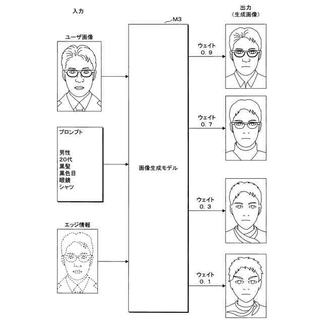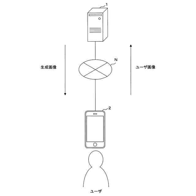 図1は、情報処理システムSの概要を示す説明図である。情報処理システムSは、情報処理装置1とユーザ端末2とを備える。情報処理装置1は例えばクラウドサーバであり、ユーザ端末2はユーザが所有するスマートフォン、タブレット端末、またはパーソナルコンピュータ、あるいはユーザが操作する証明写真機、またはプリクラ(登録商標)などのプリントシール機等である。本実施形態においては、ユーザ端末2はスマートフォンであるものとして説明する。情報処理装置1とユーザ端末2とは、ネットワークNを介して互いに通信することが可能である。ユーザ端末2は、ユーザを撮影したユーザ画像を情報処理装置1に送信する。情報処理装置1は、取得したユーザ画像に基づいて生成画像を生成し、生成画像をユーザ端末2に送信する。ユーザ端末2は、情報処理装置1から受信した生成画像を表示する。なお、ユーザ端末2が証明写真機またはプリントシール機等である場合、ユーザ端末2は、ユーザインタフェースとしての機能を有し、情報処理装置1とネットワークNを介して通信を行う装置であってもよく、情報処理装置1が実行する処理の一部または全部を実行するものであってもよい。