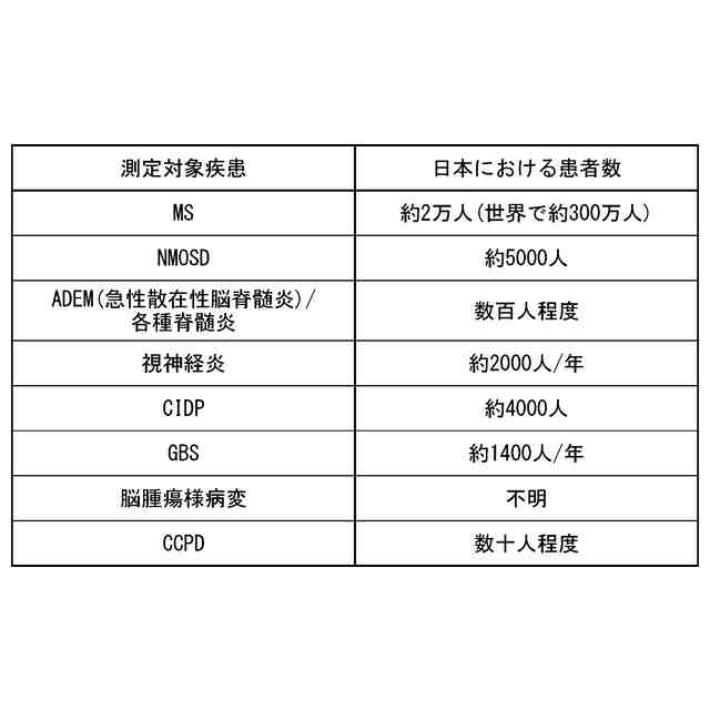 これらの症例のうち一部では、抗myelin oligodendrocyte glycoprotein(MOG)抗体が陽性である。一方では、抗AQP抗体陰性・抗MOG抗体陰性で視神経・脊髄障害の強い、MSとしては非典型的な症例も多く存在し、これらの症例については、MOG抗体等では検出することができない。このため、病態解明につながる診断バイオマーカーの開発が強く望まれている。