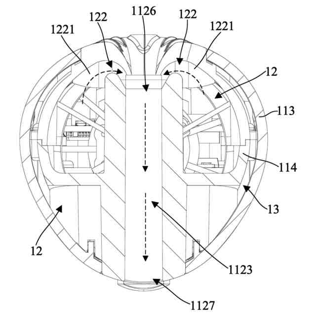 前記風吹付通路は、前記内殻内に位置し、前記風吹付通路は、風取込口及び風吹付口を有し、前記風取込口は、前記ハンドル部に位置し、前記風吹付口は、前記作動部に位置し、前記風吹付口は、前記風吹付通路及び前記風吹付空間に連通し、前記放熱通路は、前記外殻と前記内殻との間に位置し、前記放熱通路は、放熱入風口及び放熱出風口を有し、前記放熱入風口は、前記ハンドル部に位置し且つ前記風吹付通路に連通し、前記放熱出風口は、前記作動部に位置し、